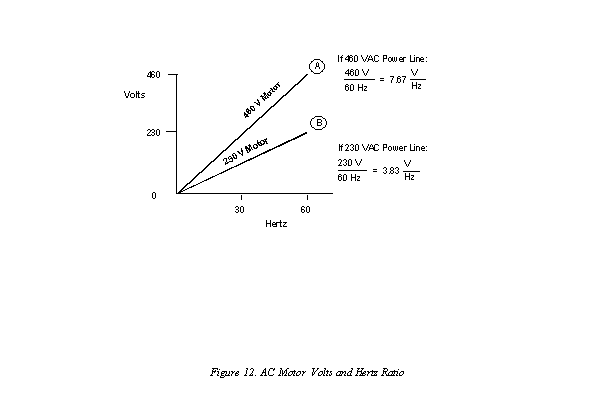 Figure 12 shows how a VFD controls the amount of torque (twisting motion) developed by the shaft. An existing fan, connected across the power line, would see voltage and hertz ratios of those shown in the figure for 230 (point B) or 460 volt (point A) rated motors (e.g. 60 Hz in the U.S.). When a VFD is connected to the motor, it provides the same ratio of voltage and Hz that the power line would provide. Therefore, the ability of the motor to produce rotation and torque is not compromised, when a VFD is connected.